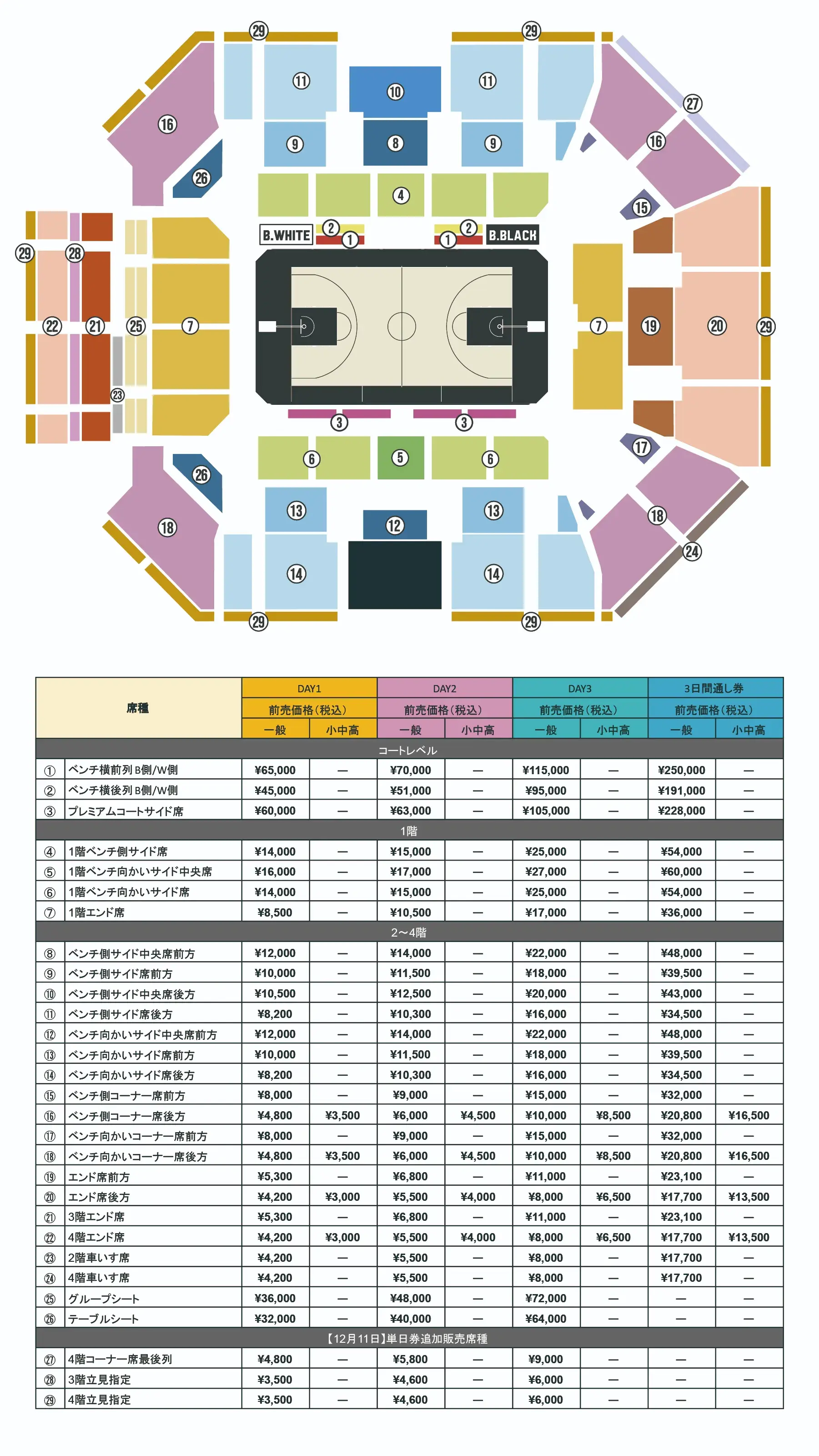 ・下記席種は12/3及び12/4の販売対象外とし、12/11の単日券追加販売にて販売いたします
