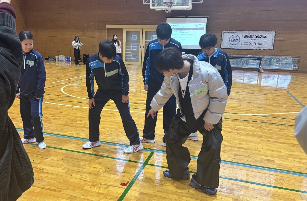 プロジェクトの幕開けとして、11月下旬に長崎県平戸市の生月中学校にて「TIP OFF会」を開催。バスケットボールとダンスのクリニック、さらにリモート期間に使用する「AIスマートコーチ」の使い方レクチャーを実施しました。
