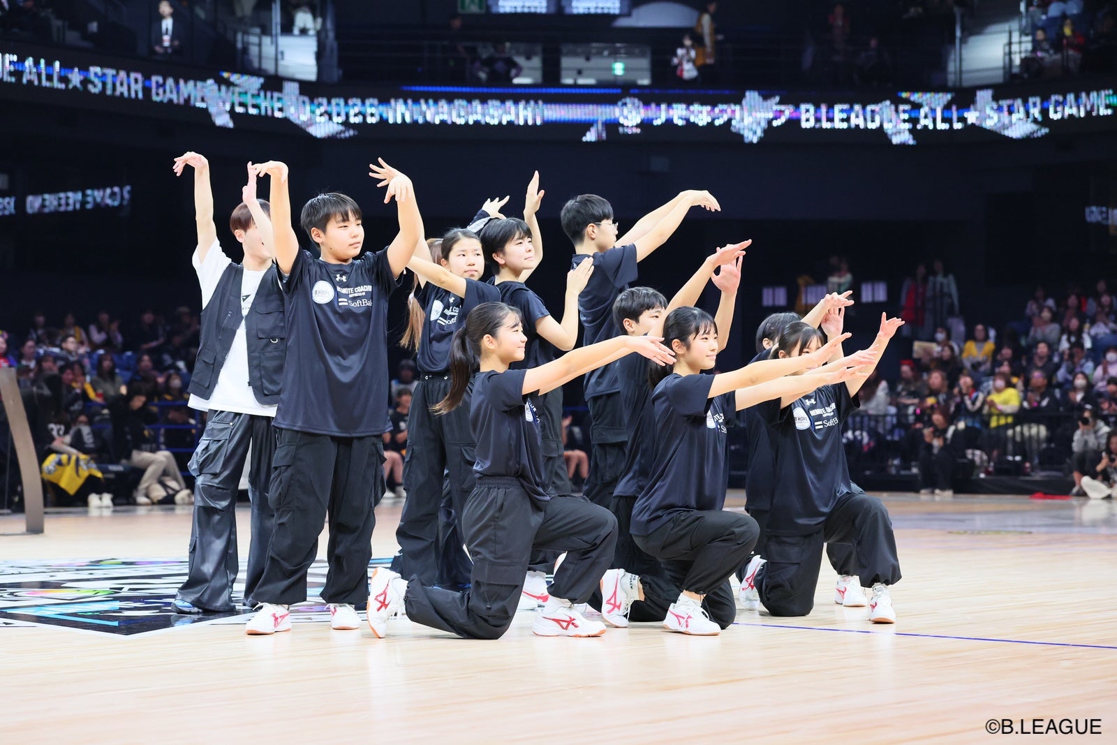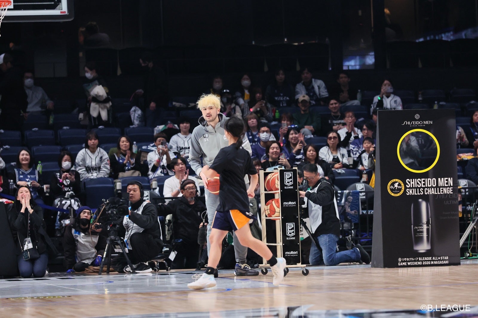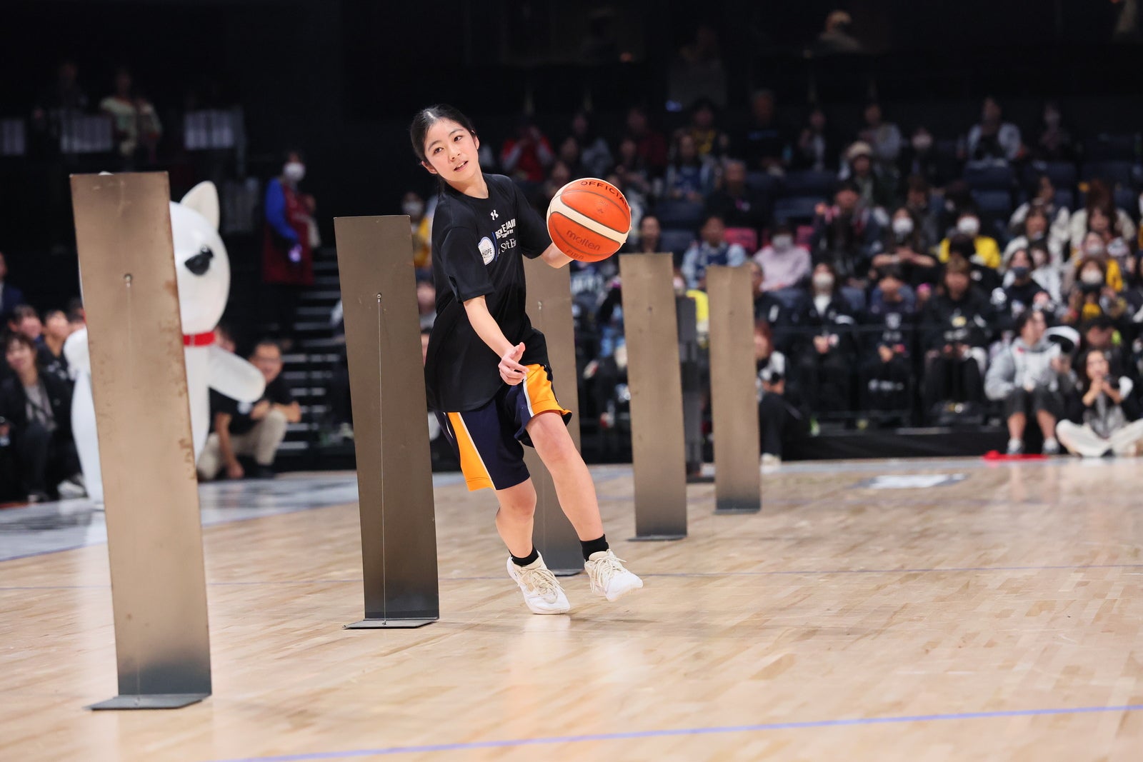 本番では、前日のコンテスト(スキルズチャレンジ)に出場した 千葉ジェッツの瀬川琉久選手、そしてリモート指導にも携わった 長崎ヴェルカの川真田紘也選手が特別ゲストで登場。多くのB.LEAGUEファンが見守る中、トップバッターを務めた素晴らしいダンスパフォーマンスや、瀬川選手のタイム(32.9秒)まであと少しに迫る好プレーで会場を沸かせた「Jr.スキルズチャレンジ」と、お披露目は大成功を納めました。