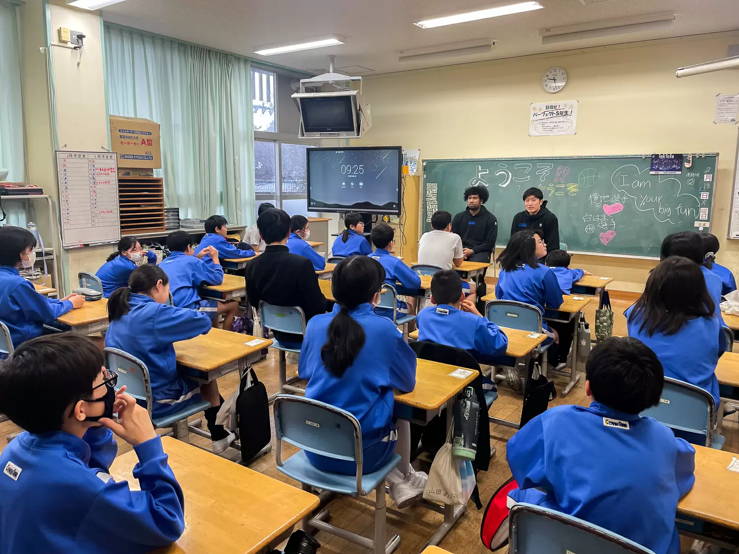 夢授業で島根県内の学校を訪れたコティ・クラーク選手、北川弘選手(左)