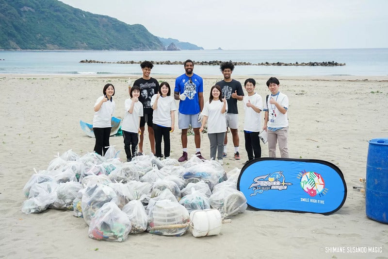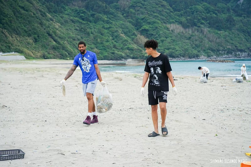 島根スサノオマジックのジェームズ・マイケル・マカドゥ選手は5月、家族とともに古浦海水浴場でビーチクリーン活動を行いました。きっかけは、松江の海辺で長女がこぼした「なんでこんなに汚れているの?」という一言から。その気づきはクラブやチームメイトを動かし、地域の人々を巻き込む取り組みへと発展しました。「地球は誰かが守ってくれるものではなく、みんなで守るもの」というマカドゥ選手に環境への想いと、家族で始めた行動に込めた願いを聞きました。