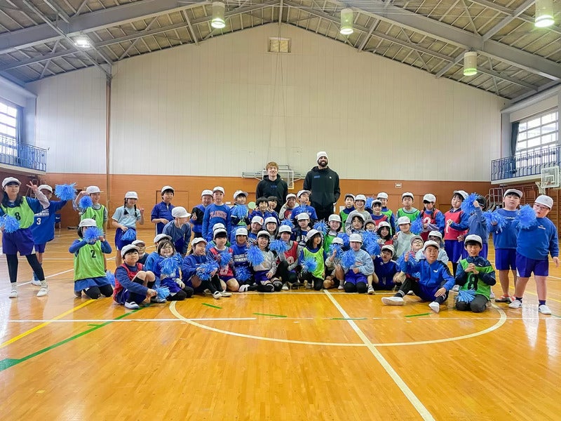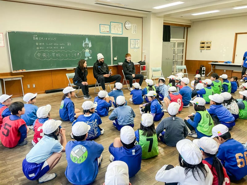 夢授業で島根県内の学校を訪れたジェームズ・マイケル・マカドゥ選手と納見悠仁選手