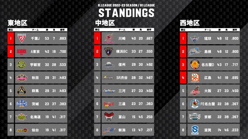 B1歴代最多記録となる24連勝を達成するなど、2位のアルバルク東京を寄せつけなかった千葉ジェッツが東地区を制覇。53勝7敗(勝率0.883)と、2018-19シーズンに記録した52勝8敗(勝率0.867)を上回り、B1最高勝率を打ち立てた。前年王者の宇都宮ブレックスは苦戦を強いられ、「日本生命B.LEAGUE CHAMPIONSHIP 2022-23」出場を逃す結果に終わった。