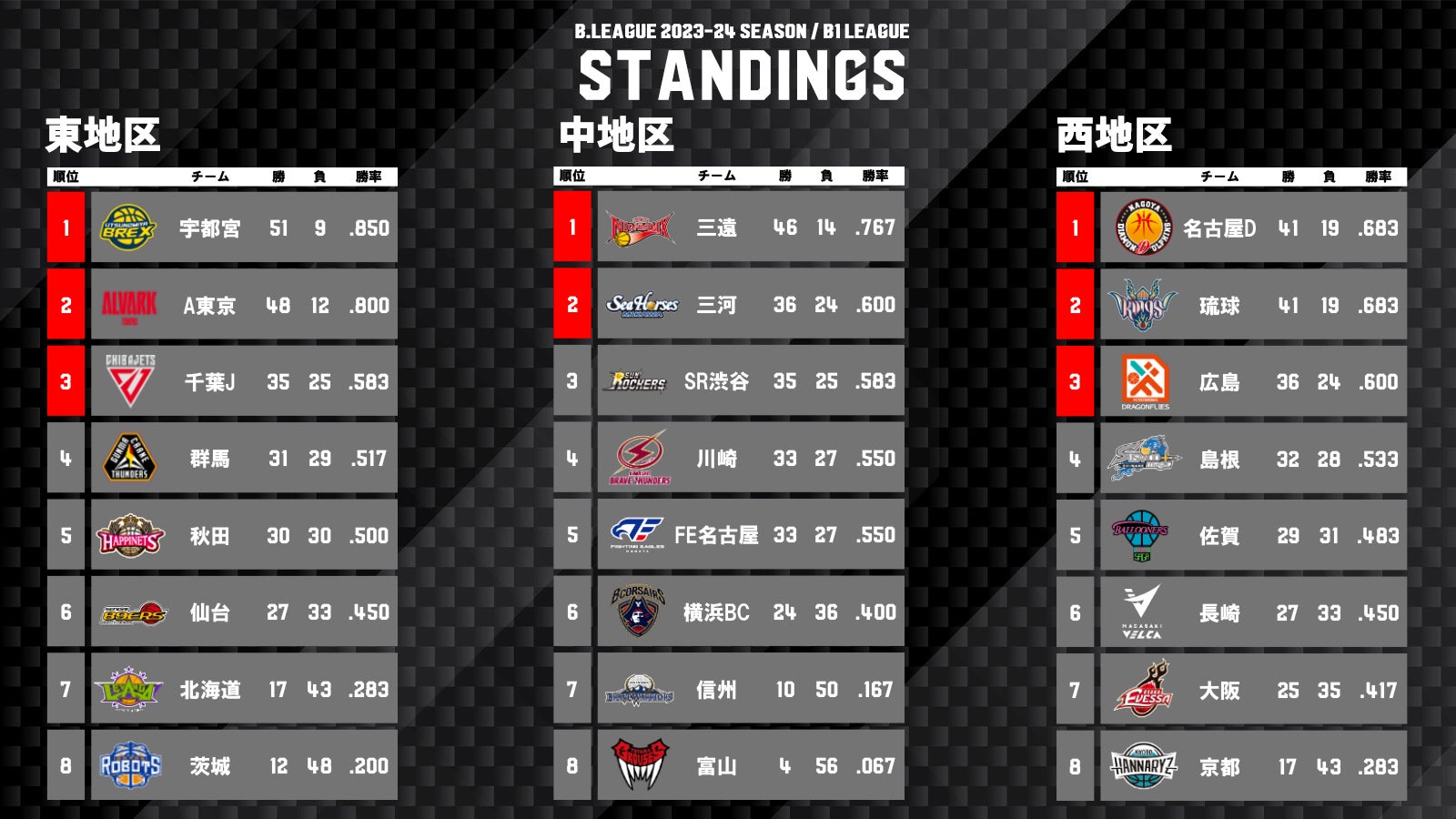 中地区は大野篤史ヘッドコーチ体制2シーズン目の三遠ネオフェニックスが首位を独走し、9試合を残して初の中地区優勝を達成した。2位争いは混戦を極め、最終節を前にシーホース三河、サンロッカーズ渋谷、川崎ブレイブサンダースによる三つ巴の争い。首位の三遠に連勝した三河が2位の座をキープし、「日本生命 B.LEAGUE CHAMPIONSHIP 2023-24」出場を決めた。