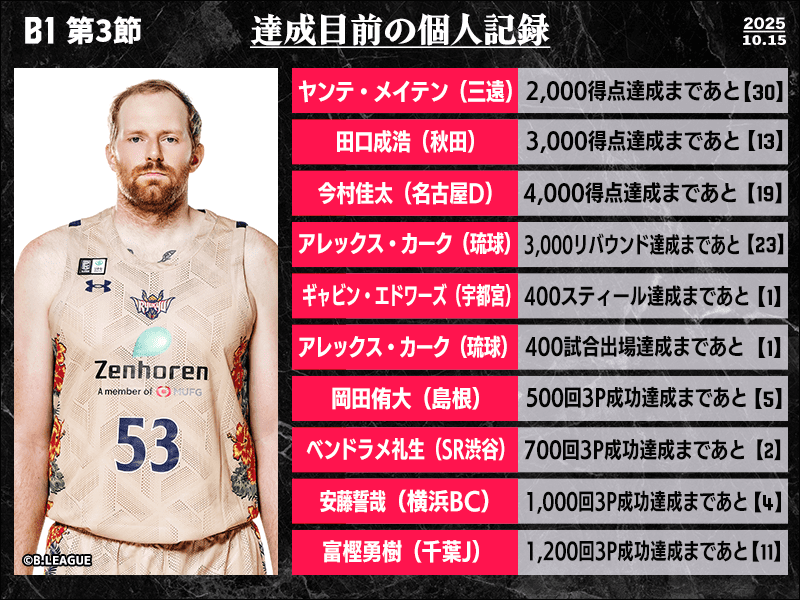 B1第3節において達成が期待される個人記録をバスケットボールキング編集部がピックアップ。今村佳太(名古屋D)は通算36人が達成している4000得点まで19としており、アレックス・カーク(琉球)は史上56人目となる400試合出場、ギャビン・エドワーズ(宇都宮)は同16人目となる400スティールにリーチをかけている。3Pでは岡田侑大(島根)が500回、ベンドラメ礼生(SR渋谷)が700回、安藤誓哉(横浜BC)が富樫勇樹(千葉J)に続く1000回成功を射程圏内にとらえている。