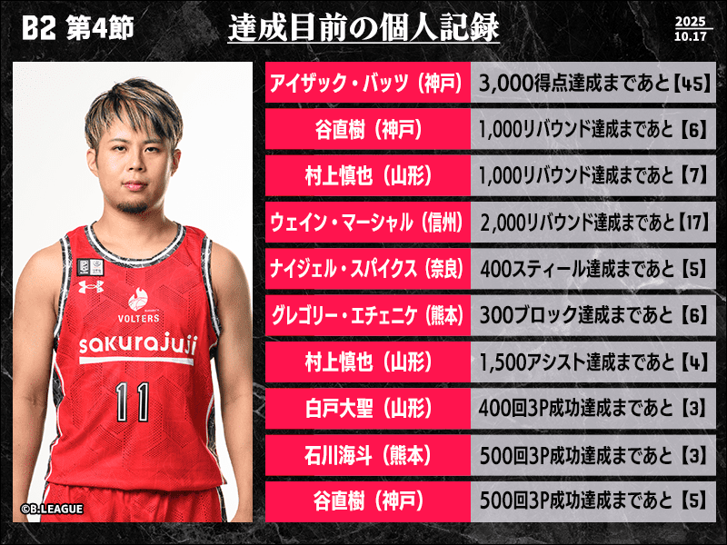 B2第4節において達成が期待される個人記録をバスケットボールキング編集部がピックアップ。複数の記録が目前に迫る村上慎也(山形)は、古野や石川ら過去4人が達成している1500アシストまであと4に迫っている。また、石川(熊本)と谷直樹(神戸)は500回3P成功が射程圏内。こちらはテレンス・ウッドベリー、俊野佳彦、古野ら過去8人が達成している大台だ。