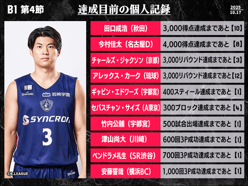 B1第4節において達成が期待される個人記録をバスケットボールキング編集部がピックアップ。チャールズ・ジャクソン(京都)とアレックス・カーク(琉球)が過去8人達成中の通算3000リバウンドに迫るほか、竹内公輔(宇都宮)は通算6人目となる500試合出場にリーチ。複数選手の達成が期待される3Pシュートについては、安藤誓哉(横浜BC)が富樫勇樹(千葉J)に続く通算1000回の大台まであと1本としている。