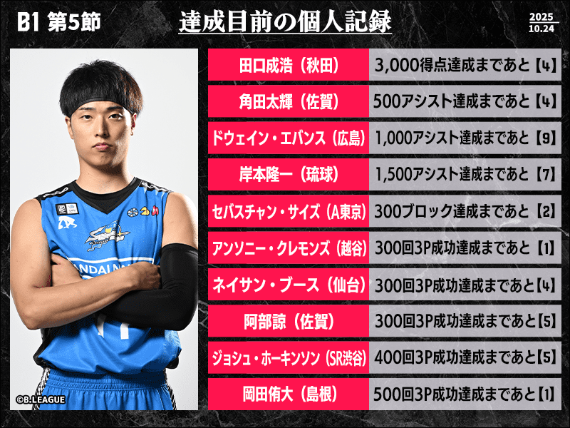 B1第5節において達成が期待される個人記録をバスケットボールキング編集部がピックアップ。セバスチャン・サイズ(A東京)が通算10人目となる通算300ブロックに迫るほか、3P成功数でジョシュ・ホーキンソン(SR渋谷)が400本まであと5本、岡田侑大(島根)が500本成功まであと1本と、今節で記録達成の可能性が大きい。