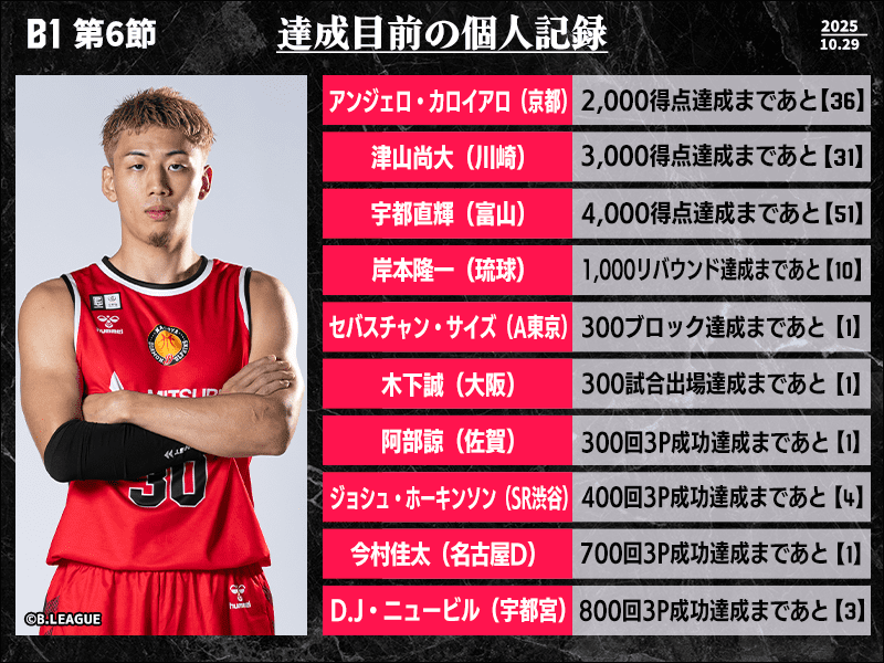 B1第6節において達成が期待される個人記録をバスケットボールキング編集部がピックアップ。来日7年目となるセバスチャン・サイズ(アルバルク東京)は史上10人目となる300ブロックショットにリーチをかけているほか、プロ9年目の今村佳太(名古屋ダイヤモンドドルフィンズ)は通算12人が達成している700回3P成功達成まであと1。また、2年連続レギュラーシーズンMVPのD.J・ニュービル(宇都宮ブレックス)は通算797本もの3Pシュートを決めており、過去8人しか達成していない800回3P成功達成を射程圏内にとらえている。