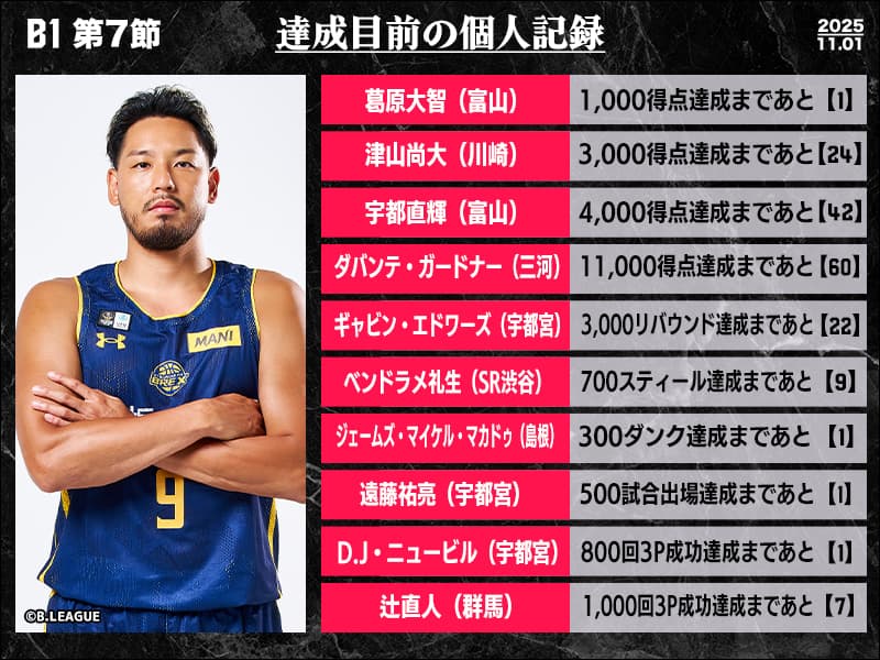 B1第7節において達成が期待される個人記録をバスケットボールキング編集部がピックアップ。葛原大智(富山グラウジーズ)が1000得点、ジェームズ・マイケル・マカドゥ(島根スサノオマジック)が300ダンク、D.J・ニュービル(宇都宮ブレックス)が800回3P成功達成とそれぞれあと【1】とリーチ状況。加えて、遠藤祐亮(宇都宮)が史上7人目の500試合出場まであと1試合となっており、11月1日にも達成予定だ。辻直人(群馬クレインサンダーズ)は3人目となる1000回3P成功まであと7本。“お祭り男”が爆発すればGAME1での達成も可能と言える。