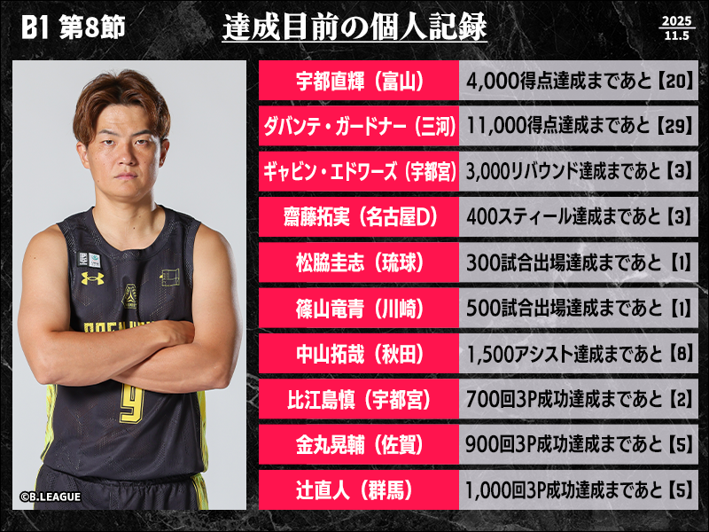 B1リーグ戦第8節において達成が期待される個人記録をバスケットボールキング編集部がピックアップ。長年Bリーグを彩ってきた名手が節目の記録を視野に捉えている中、篠山竜青(川崎)は過去7人が達成しているB1通算500試合出場達成にリーチをかけている。また、辻直人(群馬クレインサンダーズ)は、富樫勇樹(千葉J)と安藤誓哉(横浜ビー・コルセアーズ)に続く1000回3P成功達成まであと5本と射程圏内。ちなみに、辻はBリーグ以前のトップリーグを合算した個人通算記録でも1,500回3P成功達成まであと2に迫っており、こちらは達成すれば日本国内史上初の快挙となる。