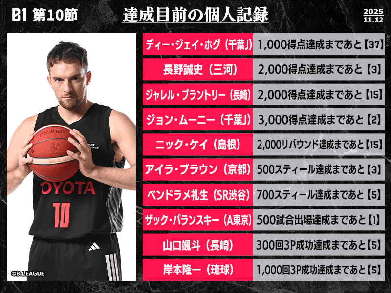 B1リーグ戦第10節において達成が期待される個人記録をバスケットボールキング編集部がピックアップ。千葉ジェッツを支えるジョン・ムーニーとディー・ジェイ・ホグが節目の得点記録に近づいているほか、琉球ゴールデンキングスの岸本隆一は、富樫勇樹(千葉J)、安藤誓哉(横浜ビー・コルセアーズ)、辻直人(群馬クレインサンダーズ)に次ぐ史上4人目となる3Pシュート1000回成功が射程圏内に。また、アルバルク東京のキャプテンを務めるザック・バランスキーは、過去8人が達成している500試合出場にリーチをかけている。
