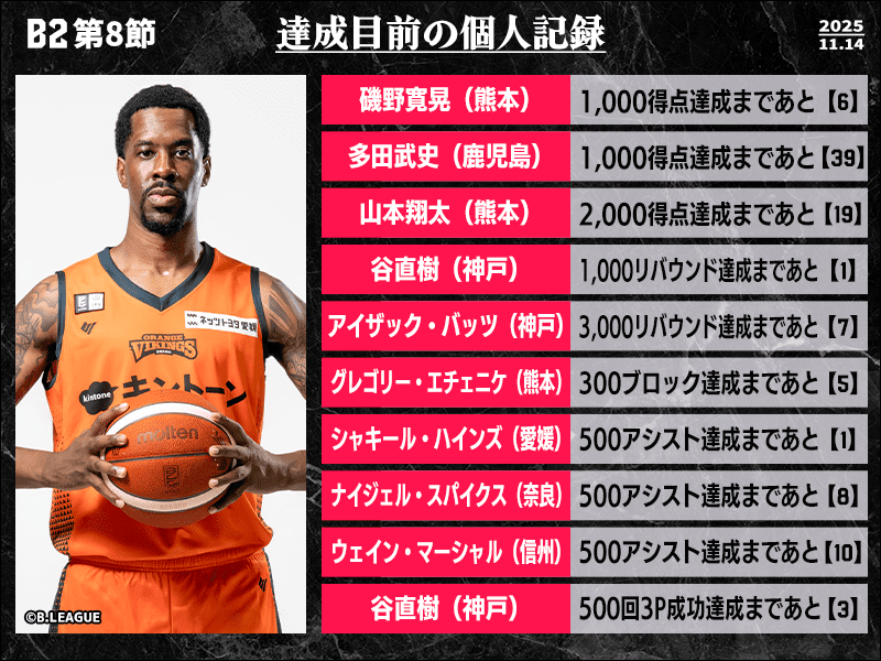 B2リーグ戦第8節において達成が期待される個人記録をバスケットボールキング編集部がピックアップ。今シーズン16.0得点と好調な山本翔太(熊本ヴォルターズ)は2000得点達成まであと19に迫っているほか、好調な愛媛オレンジバイキングスをけん引するシャキール・ハインズは500アシストにリーチをかけている。また、神戸ストークスのアイザック・バッツは、3000リバウンドまであと7。達成すれば、B2史上最多3024リバウンドを記録しているユージーン・フェルプス(富山グラウジーズ)に次ぐ史上2人目の大台到達となる。