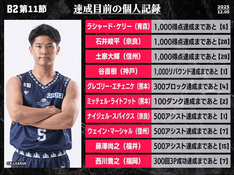 B2リーグ戦第11節において達成が期待される個人記録をバスケットボールキング編集部がピックアップ。土家大輝(信州ブレイブウォリアーズ)は直近5試合で平均19.6得点と好調をキープしており、あと29に迫る1000得点を射程圏内にとらえている。藤澤尚之(福井ブローウィンズ)も今シーズンはキャリアハイペースの6.1アシストを挙げており、過去72名が達成している500アシスト到達の可能性がありそうだ。今節はチームを勢いづける2人の活躍に期待だ。
