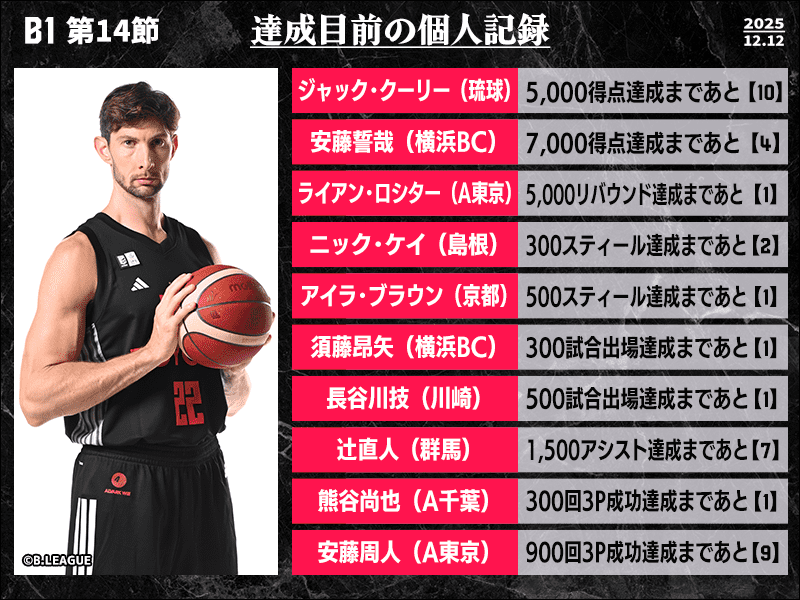 B1リーグ戦第14節において達成が期待される個人記録をバスケットボールキング編集部がピックアップ。今節はライアン・ロシター(アルバルク東京)が史上初の通算5000リバウンドにリーチをかけているほか、安藤誓哉(横浜ビー・コルセアーズ)は史上4人目となる7000得点、アイラ・ブラウン(京都ハンナリーズ)は同7人目の500スティール、安藤周人(A東京)は同7人目の900回3P成功が射程圏内に入っている。また、長谷川技(川崎ブレイブサンダース)は過去12人が達成した500試合出場が目前。達成すれば、川崎でプレー経験がある選手では藤井祐眞(現群馬クレインサンダーズ)、篠山竜青に次ぐ3人目の大台到達となる。