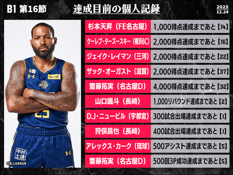 B1リーグ第16節において達成が期待される個人記録をバスケットボールキング編集部がピックアップ。今節は過去119人が達成してきたB1通算300試合出場にリーチをかけているD.J・ニュービルに注目だ。2020-21シーズンに大阪エヴェッサでB1デビューし、2023-24シーズンに宇都宮ブレックスへ移籍してからは、大きな負傷もなく全145試合に出場してきた。直近2年連続でレギュラーシーズンMVPを受賞しているエースは、今シーズンもチーム内トップとなる平均19.8得点(リーグ4位)、7.0アシスト(リーグ2位)と健在。サンロッカーズ渋谷をホームに迎え撃つ今夜は、自身の記録達成を白星で飾ることができるか。