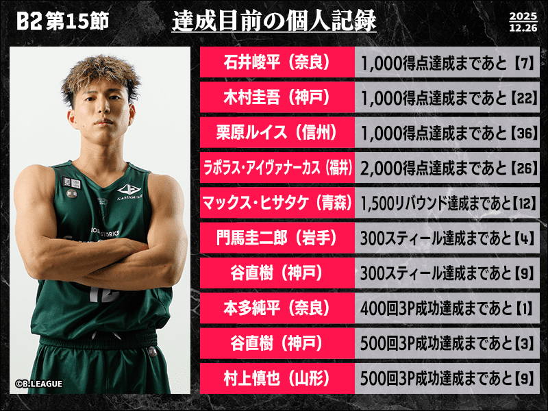 B2リーグ第15節において達成が期待される個人記録をバスケットボールキング編集部がピックアップ。今節はGLION ARENA KOBEで行われる神戸ストークスvsバンビシャス奈良の2連戦で複数の記録が達成されそうだ。奈良は石井峻平が1000得点まであと7、本多純平が史上22人目の400回3P成功にリーチ。対する神戸も谷直樹が通算10人が達成している500回3P成功まであと3、木村圭吾が1000得点を射程圏内にとらえている。売出し中の若手とチームを支えてきたベテランに祝福の時は訪れるか。“夢のアリーナ”で繰り広げられる関西ダービーに注目だ。
