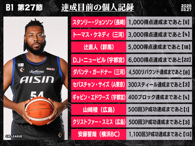 B1リーグ戦の第27節において達成が期待される個人記録をバスケットボールキング編集部がピックアップ。シーホース三河のダバンテ・ガードナーは、通算3人目となる4500リバウンドが目前に。今シーズン平均6.9リバウンドの大黒柱にとっては、十分に達成を狙える数字だ。今シーズンから長崎ヴェルカに加入し、チームを導くスタンリー・ジョンソンは1000得点に迫っている。今シーズン平均23.1得点のエーススコアラーがどこまで記録を伸ばすか注目したい。宇都宮ブレックスのギャビン・エドワーズは400ブロックまで残り4。今節2試合での大台到達も決して不可能ではなく、達成すれば史上4人目となる。