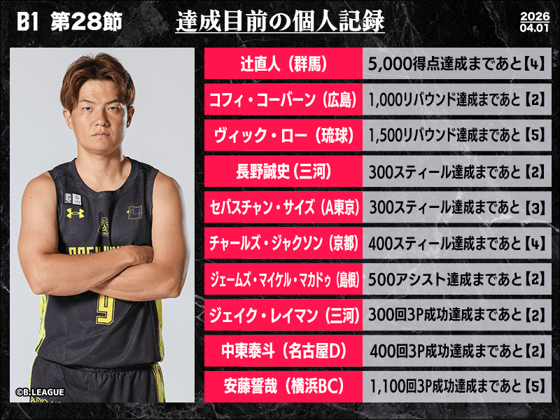 B1リーグ戦の第28節において達成が期待される個人記録をバスケットボールキング編集部がピックアップ。群馬クレインサンダーズの辻直人は5000得点の節目まであと4点と迫る。長年リーグを盛り上げてきたベテランが、ホームで節目達成を迎える瞬間に注目が集まる。横浜ビー・コルセアーズの安藤誓哉は、1100回3Pシュート成功まであと5本。今シーズン4試合で3Pシュート5本を沈めている名シューターにとっては、今節での達成も決して不可能ではない。琉球ゴールデンキングスのヴィック・ローは1500リバウンドが射程圏内に。今シーズン平均7.2リバウンドをマークしている大黒柱の大台突破にも期待したい。