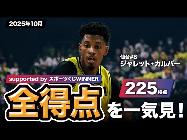 【一気見Bリーグ by スポーツくじWINNER】仙台#8 ジャレット・カルバーの2025年10月の全得点まとめ|りそなグループ B.LEAGUE 2025-26 シーズン