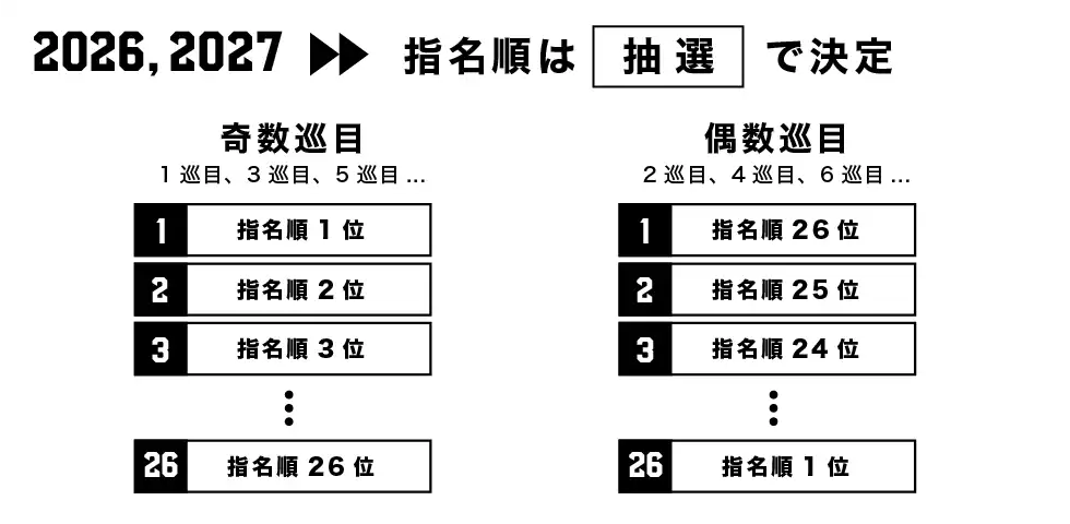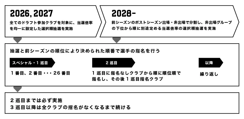 ドラフト前シーズンのプレーオフ未進出クラブを年間最終順位が低いクラブに高確率となるオッズを設定し、抽選方式により指名順を決定する