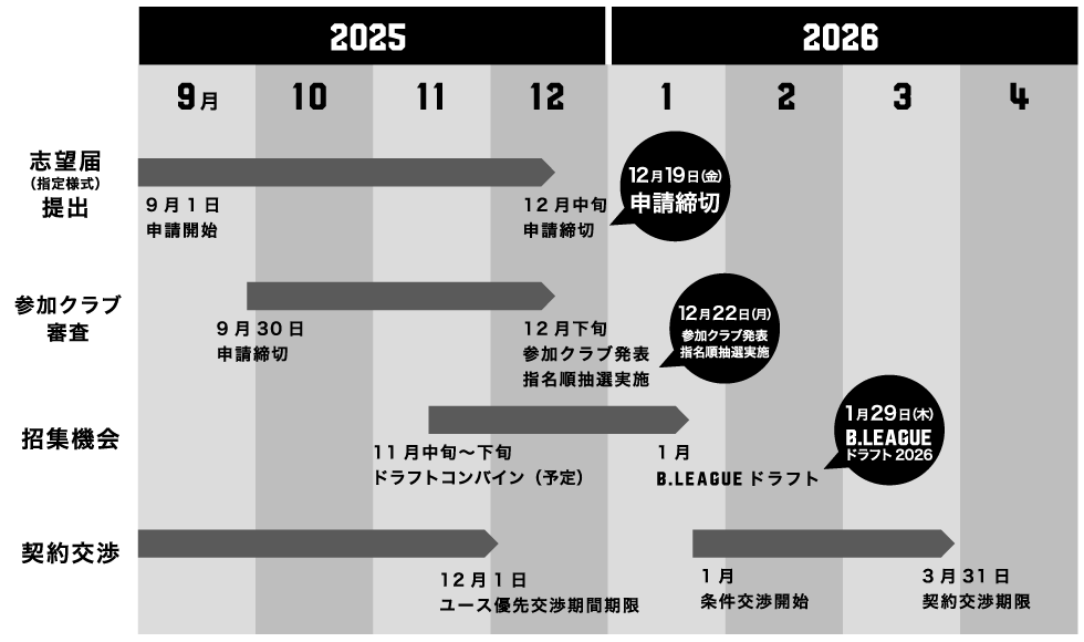 ・プロ1~3年目でB.PREMIERに所属する場合は、必ずドラフトを経由しなければならない。ただし、2025-26シーズン開幕時点で2026年6月30日を含むプロ契約を締結している選手は、以下に該当する場合もドラフト対象外