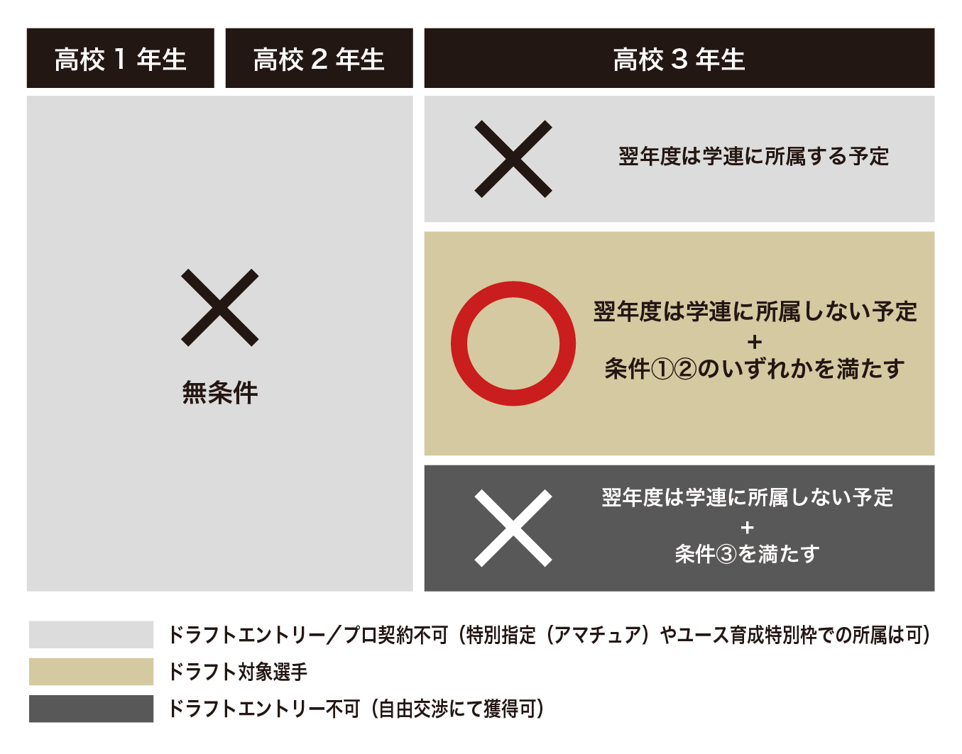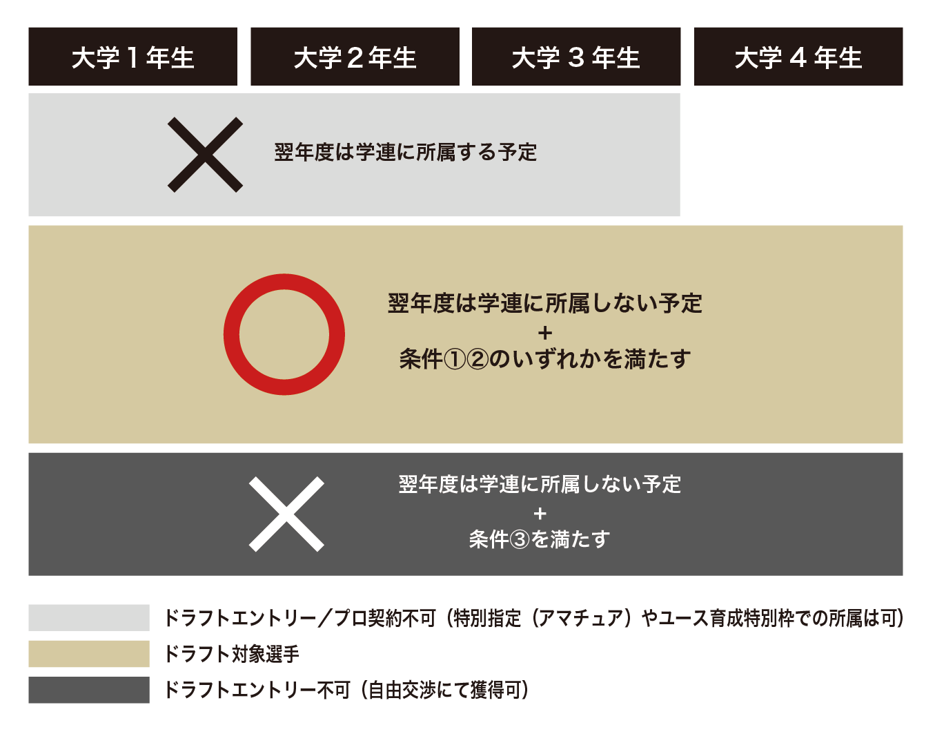 ・ドラフト開催シーズンの9月末日までに最終所属校の卒業もしくは協会登録抹消から満3年が経過している場合はドラフト対象外