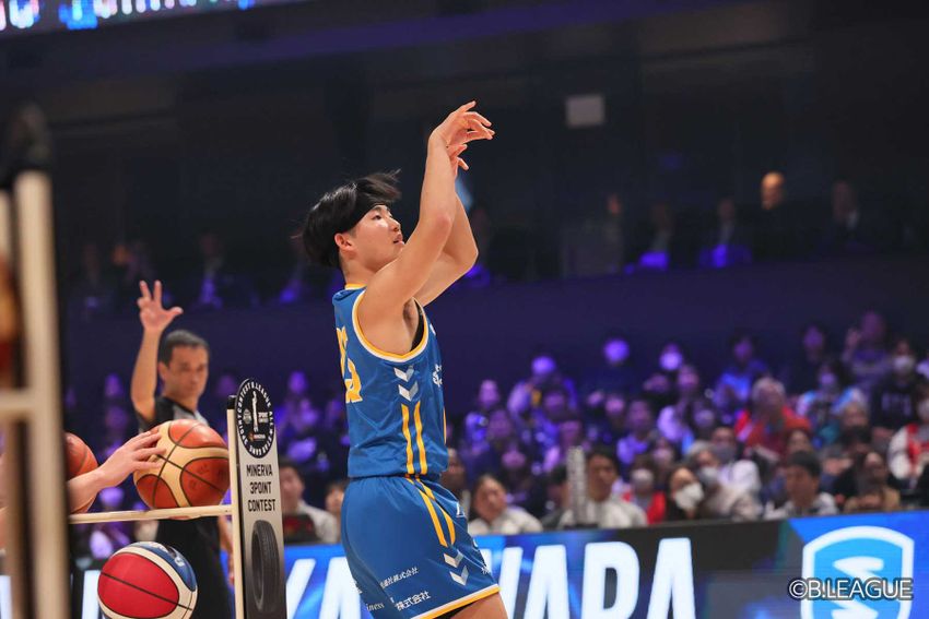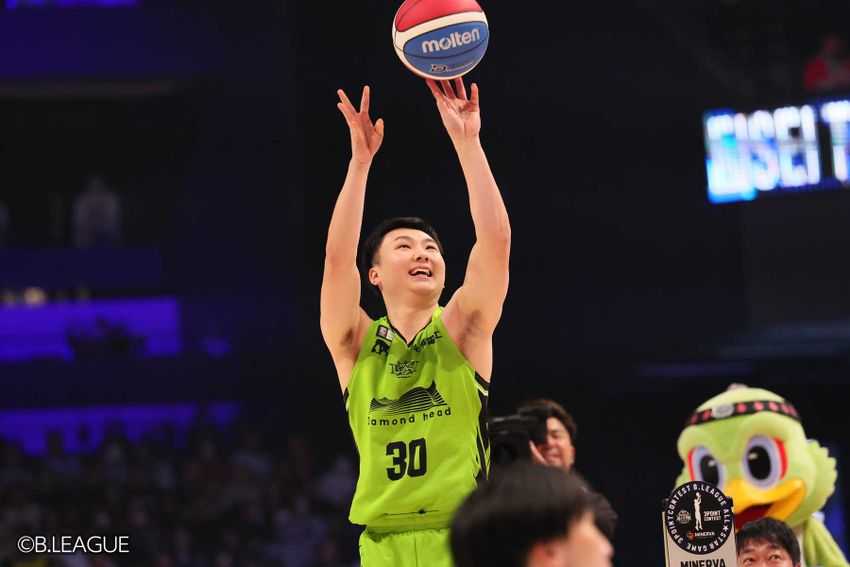 1月17日、長崎で開催されている「りそなグループ B.LEAGUE ALL-STAR GAME WEEKEND 2026 IN NAGASAKI」の2日目。リーグ屈指のシューターたちが顔を揃えた「MINERVA 3POINT CONTEST」は、サドンデスまでもつれ込む熱戦となった。トップバッターとして登場したのは、滋賀レイクスU18に所属し、トップチームでもプレーする梶原悠真。練習では23点を記録したという期待を受け、「26点を狙います!」と宣言してスタート。カラーボールを5本すべて決める勝負強さを見せ、15ポイントをマークした。