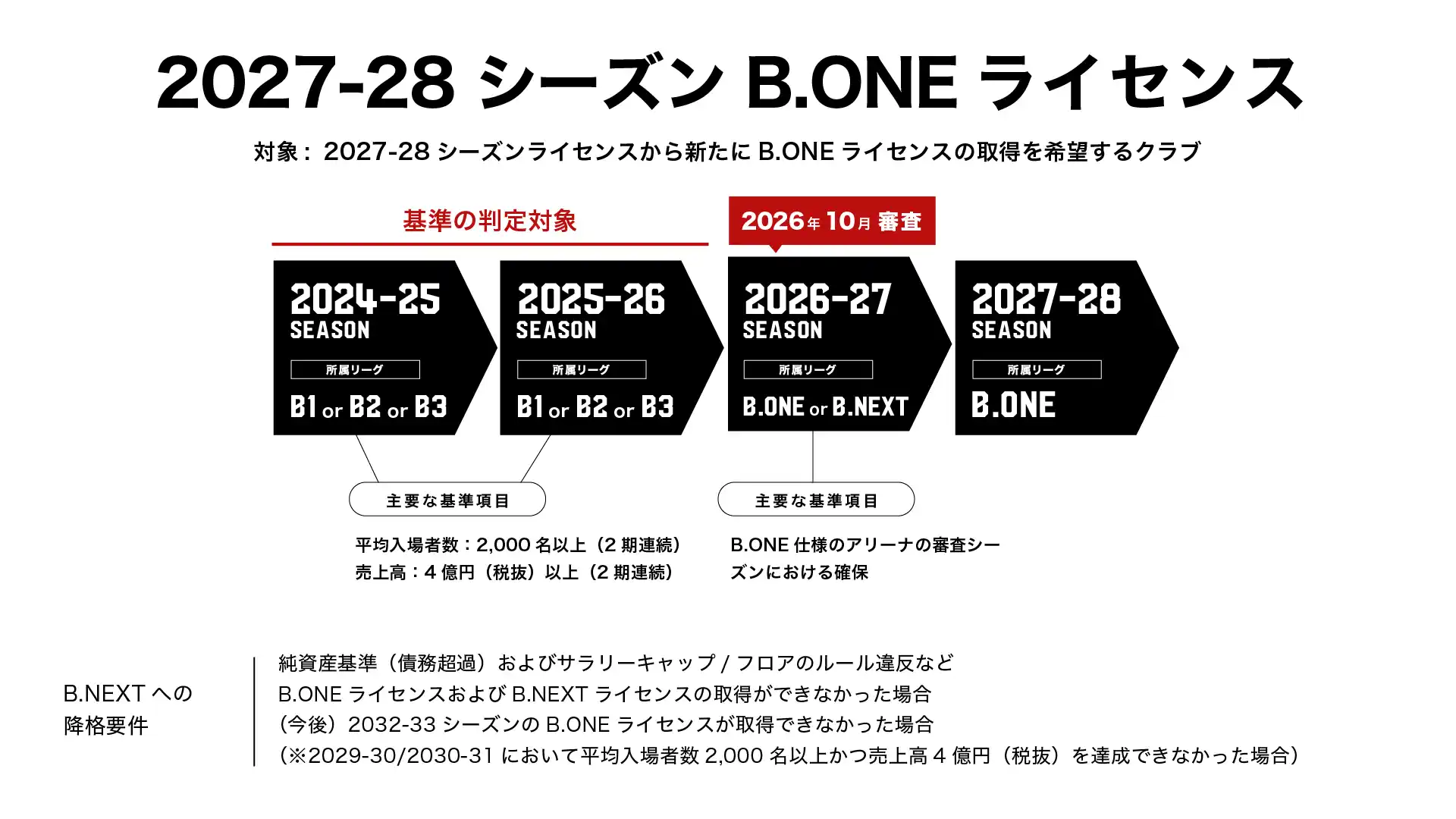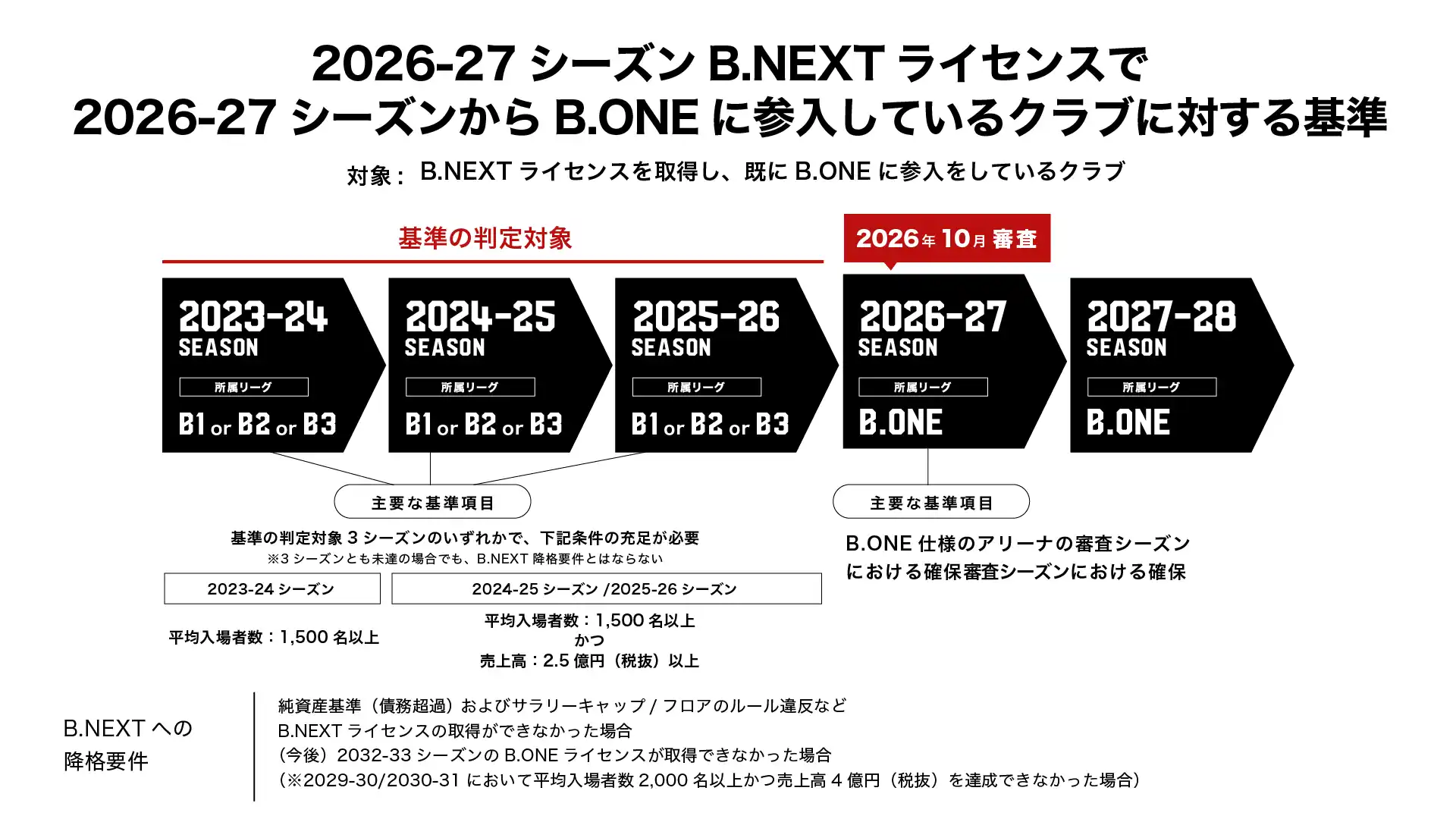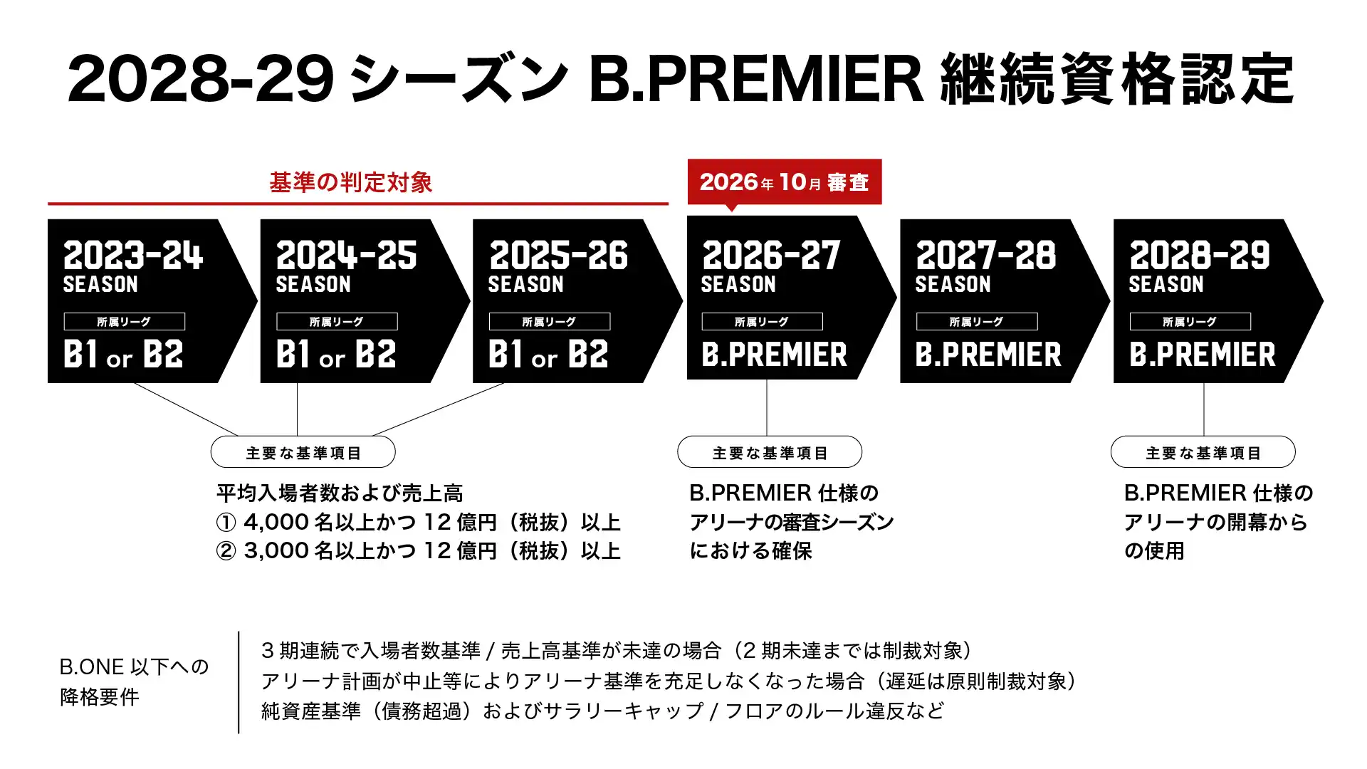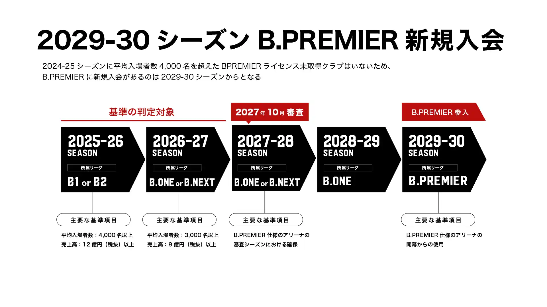 入会審査は新リーグの開幕する2026年以後も毎年実施されるため、各クラブがそれぞれの計画に沿ってB.LEAGUE PREMIERを目指すことができます。