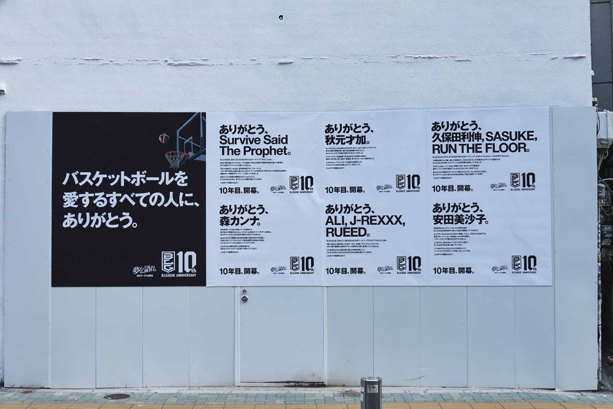 バスケットボールストリート(通称、渋谷センター街)がある渋谷を中心とした全国150箇所に、B3を含む、B.LEAGUEの全55クラブ、選手、ファンはもちろん、NBAやJリーグなど、リーグの垣根を越えてバスケットボールを支えてくださった皆様へ贈るメッセージを掲出します。その一部をご紹介します。