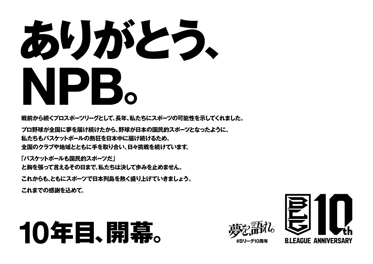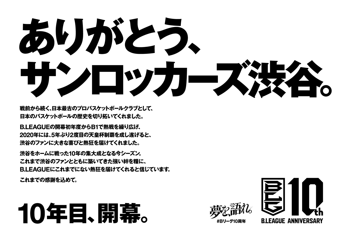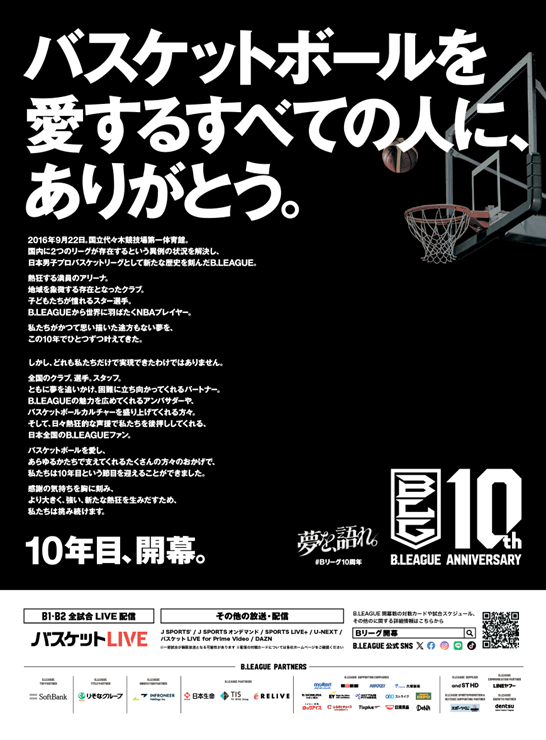 この10年間の感謝、次なる夢へと向けた決意表明として、B.LEAGUE史上初、史上最多となる大規模な感謝広告を日本全国で展開いたします。B.LEAGUEは改めて10年間の感謝を胸に刻んで10月よりシーズンが開幕し、2026年秋より始まるB.革新に向けても引き続き挑戦していきます。