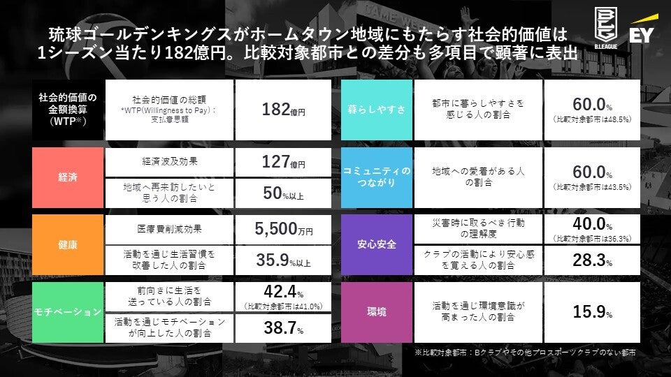 公益社団法人ジャパン・プロフェッショナル・バスケットボールリーグ(東京都文京区、チェアマン:島田 慎二 以下「B.LEAGUE」)は、EY Japan株式会社(東京都千代田区、代表取締役社長:松浦 利治、以下「EY Japan」)と、B.LEAGUE所属クラブがホームタウン地域に生み出す価値を明確化するため、経済的・社会的価値を定量化する調査を実施いたしました。