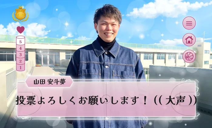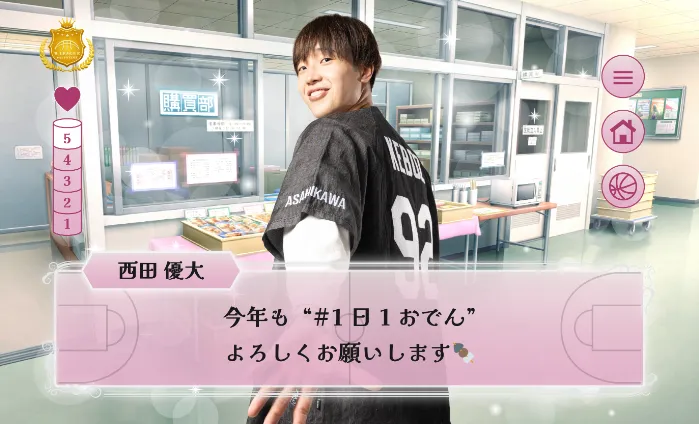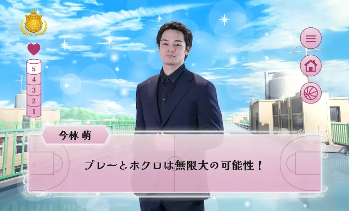 - 秋田ノーザンハピネッツ所属のバスケットボール選手。ポジションはPG。スリーポイントシュートが武器。努力を惜しまない期待の「肝っ玉ルーキー」。先輩PGの藤永佳昭選手に憧れ、モテテクも研究中。お笑いの師匠は田口成浩選手。